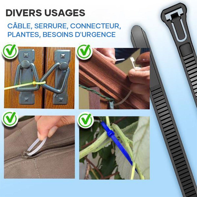 - 🍊 Réutilisable - Chaque fois que vous souhaitez ajuster le serrage ou le retirer, appuyez simplement sur le levier/bouton et relâchez-le, pas besoin de couper ! Plus respectueux de l'environnement que d'utiliser des serre-câbles à usage unique.