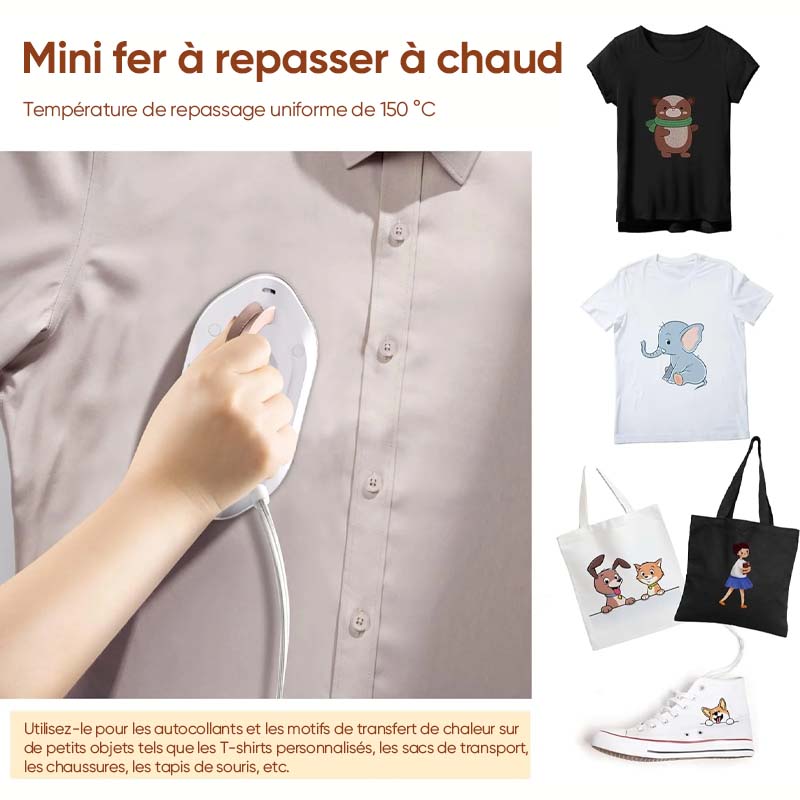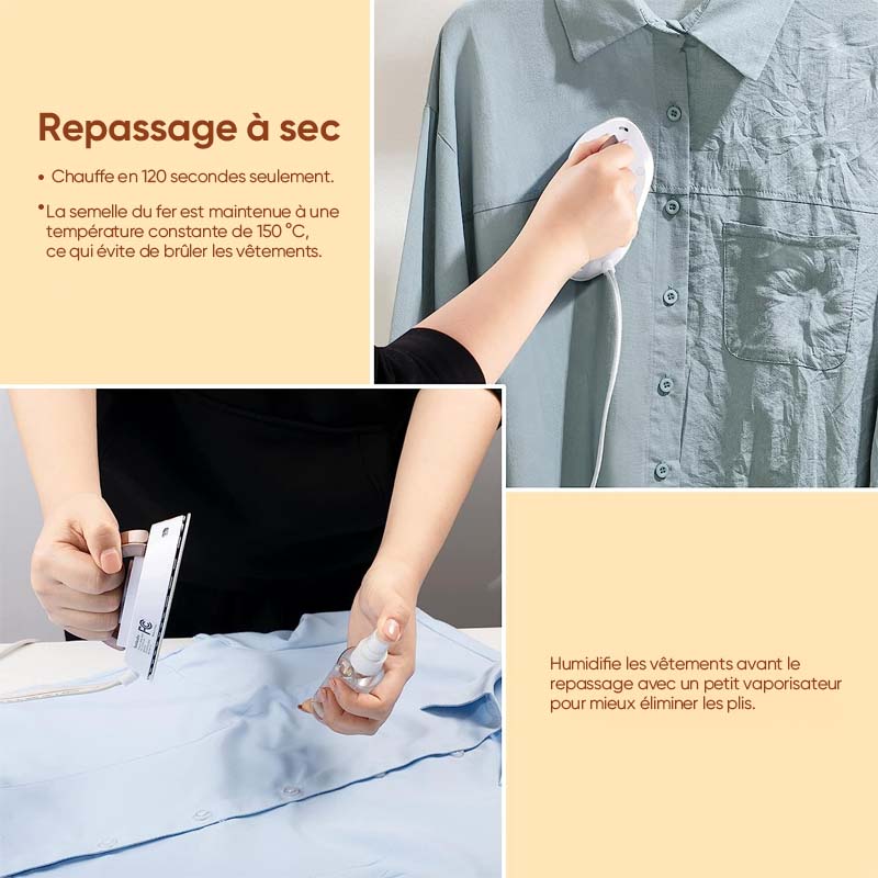 【Taille mini et extrême légèreté】Ce micro fer à repasser vous soulage ! Dimensions : 6" X 3" X 1.3", Poids : 0.95 lbs. Petit et léger, il se glisse dans n'importe quelle valise ou sac de voyage. La technologie robuste de ce fer à repasser léger permet d'obtenir des résultats rapides et infroissables. Parfait pour les voyages d'affaires et les vacances, il rend les déplacements plus sophistiqués et plus élégants.