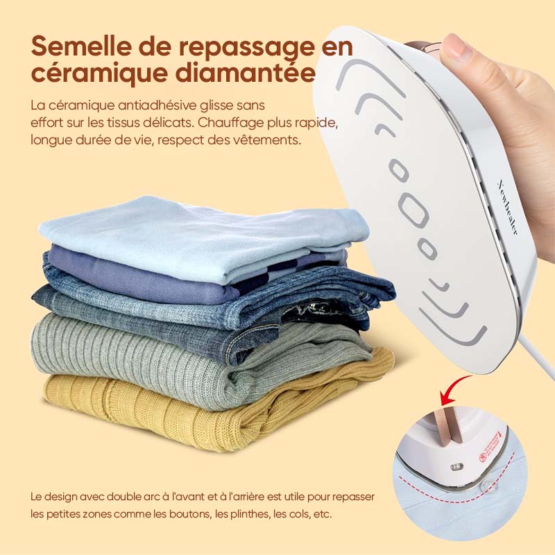 【Semelle antiadhésive en céramique】Le fer à repasser de voyage portable est équipé d'une semelle en céramique à revêtement diamant, qui conduit la chaleur rapidement et résiste mieux aux rayures que les plaques en acier inoxydable. La surface lisse et facile à nettoyer glisse sans effort sur les tissus délicats. L'arc à double pointe à l'avant et à l'arrière est utile pour repasser les petites surfaces telles que les boutons, les pattes de boutonnage, les cols, etc.
